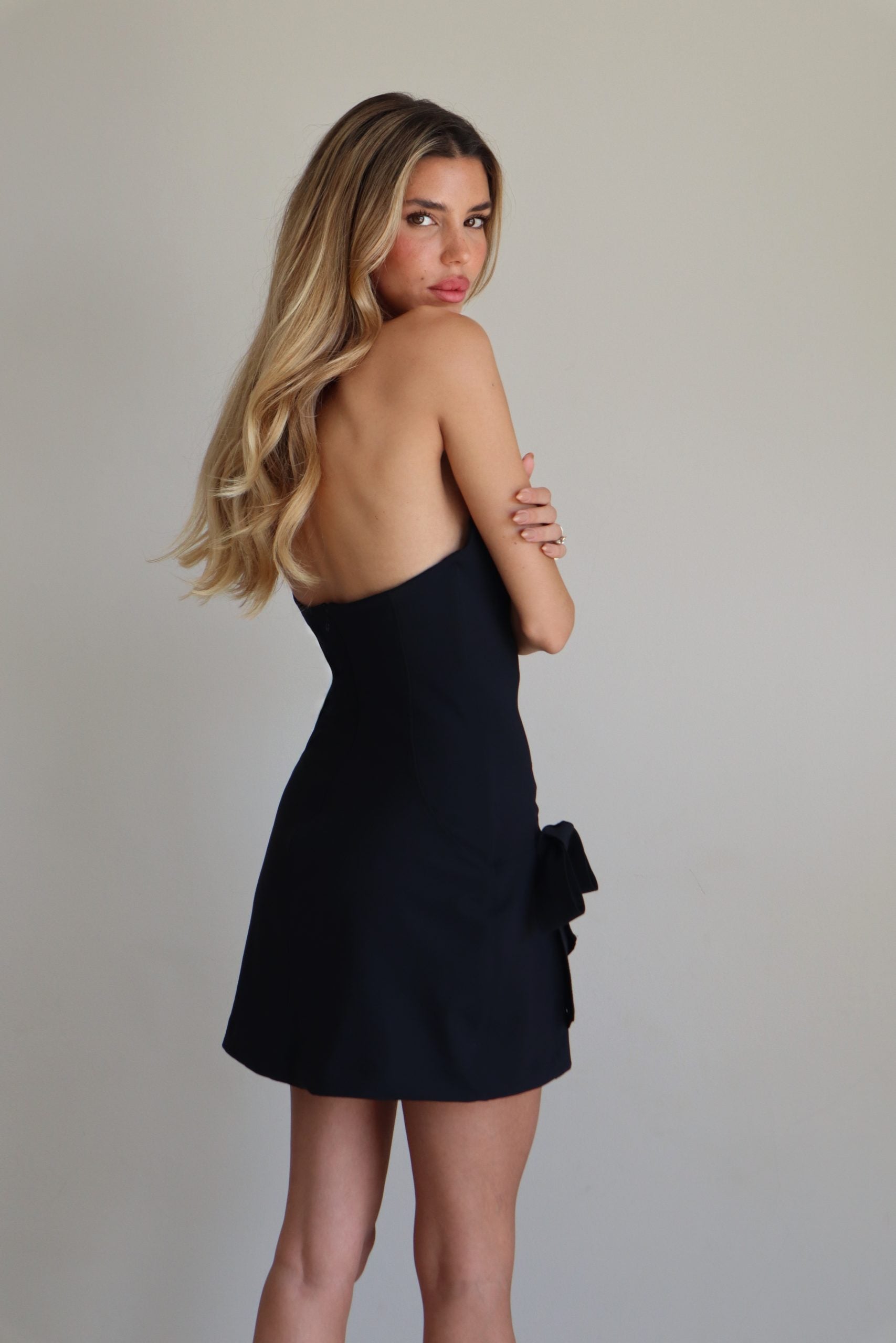 שמלת מיני סטרפלס מחויטת ובובתית